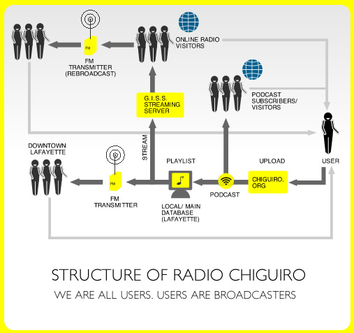 Since the beginning of this year (2007), Radio Chigüiro has been using a device named AUDIO RELAY; a portable radio transmitter designed and created by the Chicago based group of artists, TEMPORARY SERVICES. AUDIO RELAY broadcasts on the airwaves of downtown Lafayette, Indiana on the Modulated Frequency of 88.9. Our programming is continuous and presents local recordings (Demos or Live), podcasts and radio programs from different parts of the world, New Internet-bands, Mash-ups, mix-tapes and whatever people bring us to play. "Hijacked" or illegal sound practices such as bootlegs or playing the Happy-Birthday song constantly, are forms of resistance to the mass media (corporate) and copyright policies. Copyrighted productions that favor globalized mass markets want to homogenize the world and are counter-productive to local culture, people and artists.